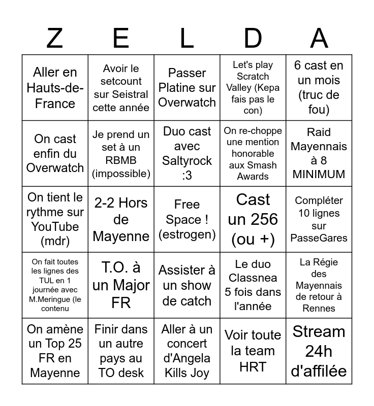 This bingo card has a free space and 24 words: T.O. à un Major FR, Finir dans un autre pays au TO desk, Duo cast avec Saltyrock :3, On amène un Top 25 FR en Mayenne, 6 cast en un mois (truc de fou), Aller en Hauts-de-France, On cast enfin du Overwatch, Avoir le setcount sur Seistral cette année, Cast un 256 (ou +), Assister à un show de catch, On re-choppe une mention honorable aux Smash Awards, On tient le rythme sur YouTube (mdr), Le duo Classnea 5 fois dans l'année, La Régie des Mayennais de retour à Rennes, Je prend un set à un RBMB (impossible), Voir toute la team HRT, Compléter 10 lignes sur PasseGares, Passer Platine sur Overwatch, Raid Mayennais à 8 MINIMUM, 2-2 Hors de Mayenne, Stream 24h d'affilée, On fait toutes les lignes des TUL en 1 journée avec M.Meringue (le contenu, Let's play Scratch Valley (Kepa fais pas le con) and Aller à un concert d'Angela Kills Joy.