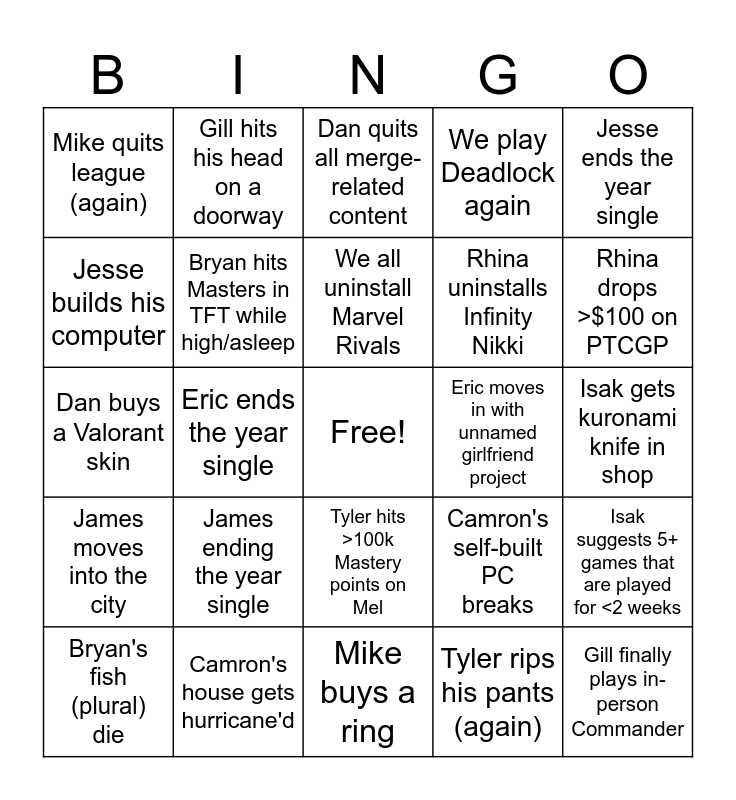 This bingo card has a free space and 24 words: James ending the year single, Camron's house gets hurricane'd, We all uninstall Marvel Rivals, Bryan's fish (plural) die, Jesse ends the year single, Mike quits league (again), Jesse builds his computer, Gill hits his head on a doorway, Eric moves in with unnamed girlfriend project, Tyler hits >100k Mastery points on Mel, Rhina uninstalls Infinity Nikki, Dan buys a Valorant skin, Camron's self-built PC breaks, Isak suggests 5+ games that are played for <2 weeks, Bryan hits Masters in TFT while high/asleep, Tyler rips his pants (again), Isak gets kuronami knife in shop, Dan quits all merge-related content, Rhina drops >$100 on PTCGP, Eric ends the year single, Gill finally plays in-person Commander, James moves into the city, We play Deadlock again and Mike buys a ring.