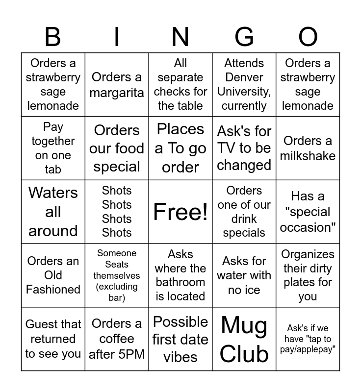This bingo card has a free space and 24 words: Someone Seats themselves (excluding bar), Orders a coffee after 5PM, Places a To go order, Guest that returned to see you, Orders a strawberry sage lemonade, Orders a strawberry sage lemonade, Pay together on one tab, Orders a margarita, Orders one of our drink specials, Asks where the bathroom is located, Ask's for TV to be changed, Waters all around, Asks for water with no ice, Organizes their dirty plates for you, Orders our food special, Mug Club, Has a "special occasion", All separate checks for the table, Orders a milkshake, Shots Shots Shots Shots, Ask's if we have "tap to pay/applepay", Orders an Old Fashioned, Attends Denver University, currently and Possible first date vibes.