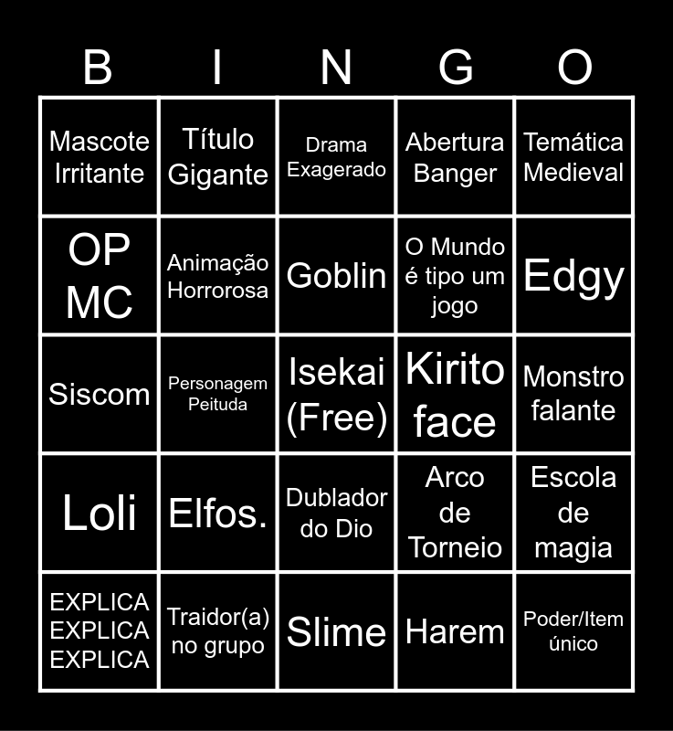 This bingo card has a free space and 24 words: Elfos., Traidor(a) no grupo, Goblin, EXPLICA EXPLICA EXPLICA, Temática Medieval, Mascote Irritante, OP MC, Título Gigante, Kirito face, Dublador do Dio, O Mundo é tipo um jogo, Siscom, Arco de Torneio, Escola de magia, Animação Horrorosa, Harem, Monstro falante, Drama Exagerado, Edgy, Personagem Peituda, Poder/Item único, Loli, Abertura Banger and Slime.