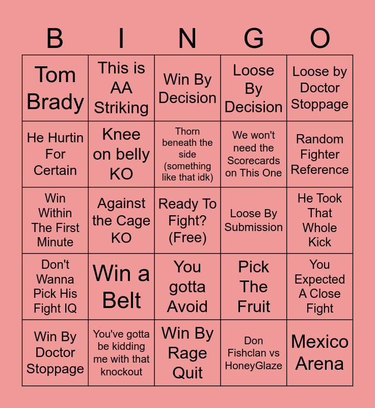 This bingo card has a free space and 24 words: Win a Belt, You've gotta be kidding me with that knockout, Thorn beneath the side (something like that idk), Win By Doctor Stoppage, Loose by Doctor Stoppage, Tom Brady, He Hurtin For Certain, This is AA Striking, Loose By Submission, You gotta Avoid, We won't need the Scorecards on This One, Win Within The First Minute, Pick The Fruit, You Expected A Close Fight, Knee on belly KO, Don Fishclan vs HoneyGlaze, He Took That Whole Kick, Win By Decision, Random Fighter Reference, Against the Cage KO, Mexico Arena, Don't Wanna Pick His Fight IQ, Loose By Decision and Win By Rage Quit.