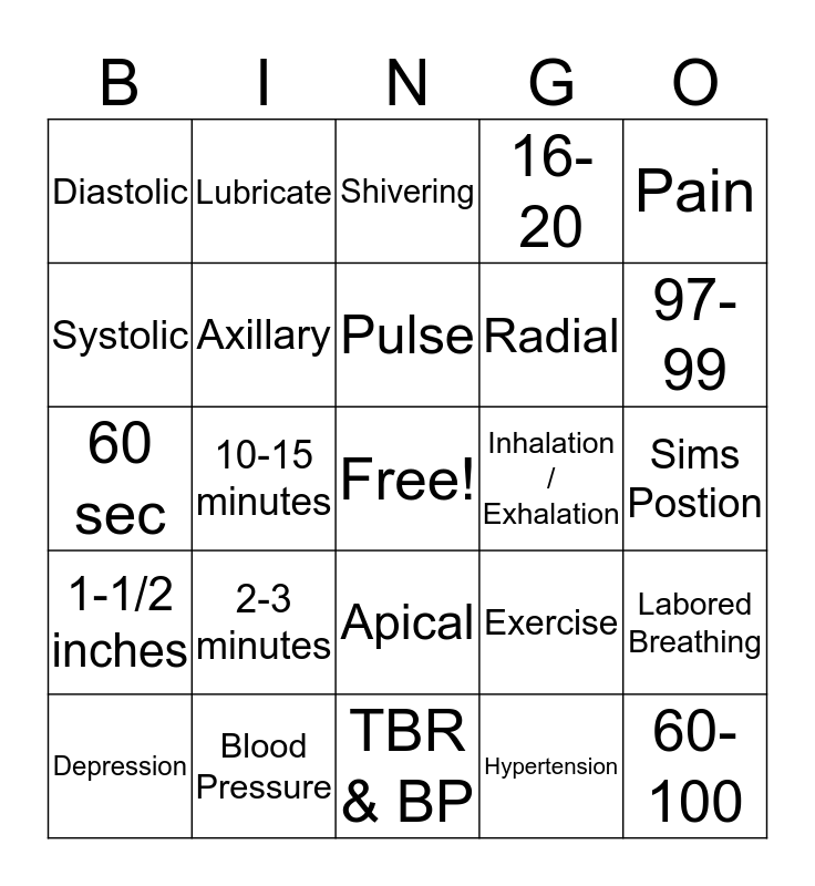 This bingo card has a free space and 24 words: 2-3 minutes, Blood Pressure, Pulse, Depression, Pain, Diastolic, Systolic, Lubricate, Inhalation / Exhalation, Apical, Radial, 60 sec, Exercise, Labored Breathing, Axillary, Hypertension, Sims Postion, Shivering, 97-99, 10-15 minutes, 60-100, 1-1/2 inches, 16-20 and TBR & BP.