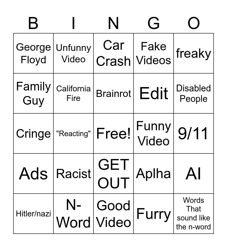 This bingo card has a free space and 24 words: Racist, N-Word, Brainrot, Hitler/nazi, freaky, George Floyd, Family Guy, Unfunny Video, Funny Video, GET OUT, Edit, Cringe, Aplha, AI, California Fire, Furry, 9/11, Car Crash, Disabled People, "Reacting", Words That sound like the n-word, Ads, Fake Videos and Good Video.