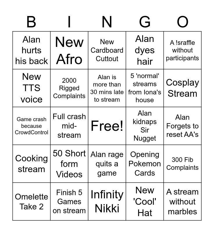 This bingo card has a free space and 37 words: Alan gets caught speeding, New friend for Phrog, 1500 Quotes, 2000 Rigged Complaints, 300 Fib Complaints, 50 Short form Videos, Alan is more than 30 mins late to stream, Steering wheel stream with a non-driving game, A !sraffle without participants, Mario Party Stream, Full crash mid-stream, Alan dyes hair, A stream without marbles, Alan Forgets to reset AA's, New TTS voice, Cooking stream, Phrog is kidnapped, New Cardboard Cuttout, Alan rage quits a game, Alan kidnaps Sir Nugget, Alan hurts his back, Cosplay Stream, Omelette Take 2, Infinity Nikki, Switch 2 Stream, New 'Cool' Hat, New Afro, Pico Park Stream, 10 Collab Streams, Alan Plays same game 2 streams in a row, Beard Accessories, Finish 5 Games on stream, Game crash because CrowdControl, Someone gets LSL twice in a row, Opening Pokemon Cards, 5 'normal' streams from Iona's house and New mobile game addiction.