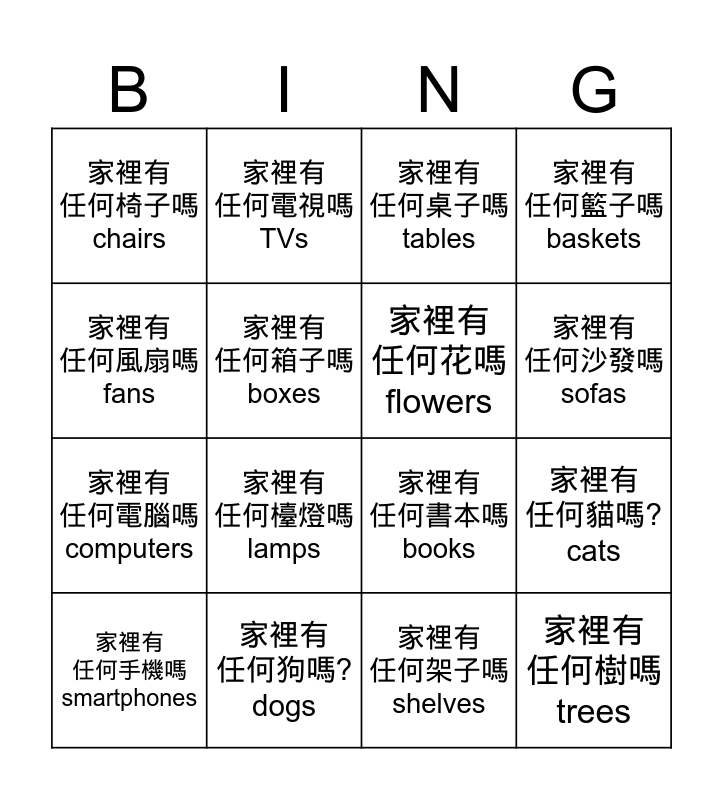 This bingo card has 16 words: 家裡有 任何狗嗎? dogs, 家裡有 任何貓嗎? cats, 家裡有 任何桌子嗎 tables, 家裡有 任何椅子嗎 chairs, 家裡有 任何電腦嗎 computers, 家裡有 任何電視嗎 TVs, 家裡有 任何書本嗎 books, 家裡有 任何架子嗎 shelves, 家裡有 任何風扇嗎 fans, 家裡有 任何箱子嗎 boxes, 家裡有 任何手機嗎 smartphones, 家裡有 任何籃子嗎 baskets, 家裡有 任何檯燈嗎 lamps, 家裡有 任何沙發嗎 sofas, 家裡有 任何花嗎 flowers and 家裡有 任何樹嗎 trees.