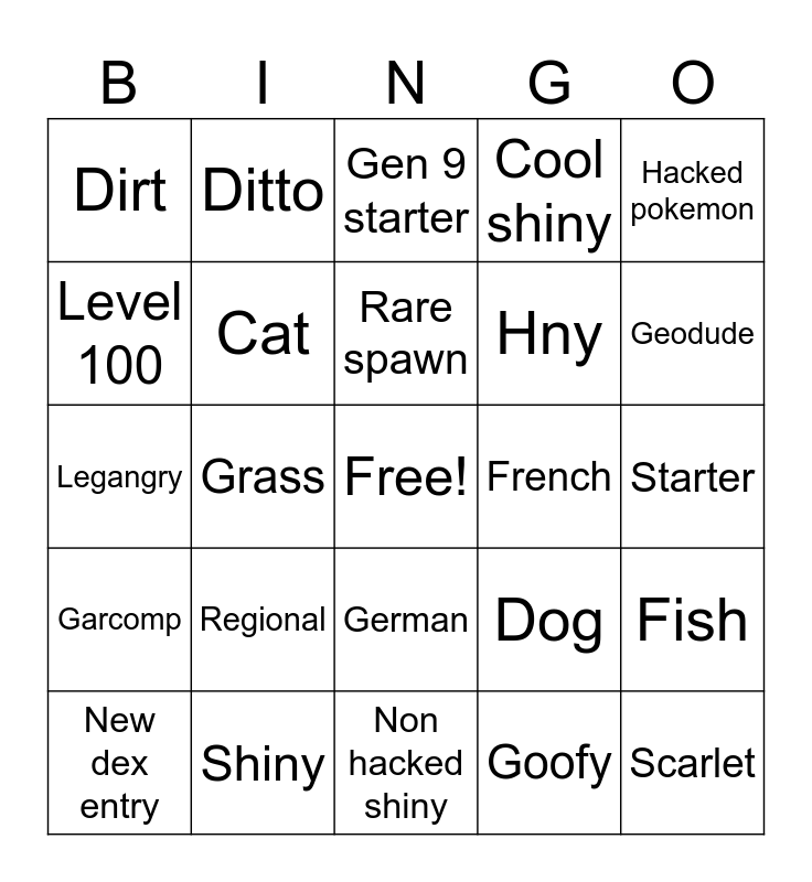 This bingo card has a free space and 24 words: Regional, Shiny, Rare spawn, New dex entry, Hacked pokemon, Dirt, Level 100, Ditto, French, German, Hny, Legangry, Dog, Fish, Cat, Goofy, Starter, Gen 9 starter, Geodude, Grass, Scarlet, Garcomp, Cool shiny and Non hacked shiny.