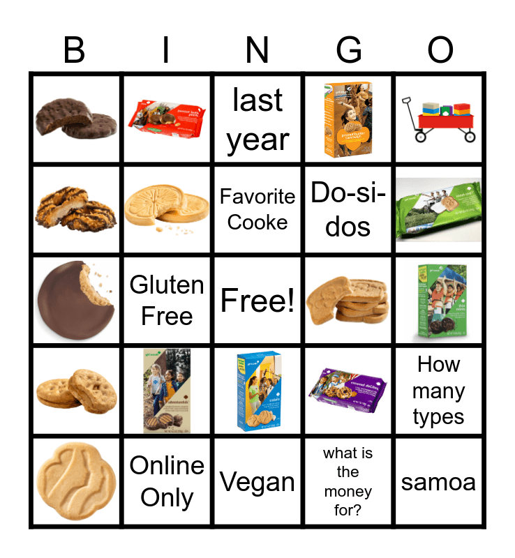This bingo card has 18 images, a free space and 11 words: 6 dollars, Gluten Free, last year, Online Only, samoa, Vegan, what is the money for?, Do-si-dos, How many types, Favorite Cooke and Founder.