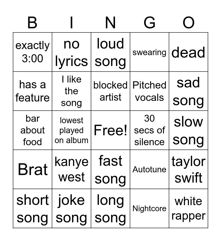 This bingo card has a free space and 37 words: Liked song, Small artist, I dislike the song, I like the song, taylor swift, kanye west, blocked artist, Artist made a song in 2025, dead, unc song, lowest played on album, swearing, white rapper, slow song, has a feature, Brat, foreign, loud song, fast song, 30 secs of silence, exactly 3:00, sad song, short song, long song, Song made me laugh, Nightcore, no lyrics, Racist, From the beef (k vs d), beat switch, flexing, joke song, bar about food, Awkward swearing, Autotune, Pitched vocals and Known producer.