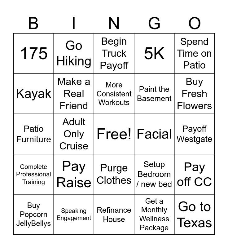 This bingo card has a free space and 24 words: Pay Raise, Speaking Engagement, More Consistent Workouts, Buy Popcorn JellyBellys, Spend Time on Patio, 175, Kayak, Go Hiking, Facial, Purge Clothes, Paint the Basement, Patio Furniture, Setup Bedroom / new bed, Pay off CC, Make a Real Friend, Get a Monthly Wellness Package, Payoff Westgate, Begin Truck Payoff, Buy Fresh Flowers, Adult Only Cruise, Go to Texas, Complete Professional Training, 5K and Refinance House.