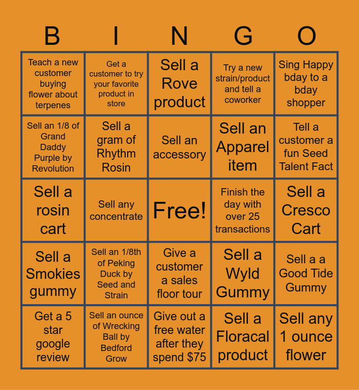 This bingo card has a free space and 24 words: Sell an 1/8th of Peking Duck by Seed and Strain, Sell an ounce of Wrecking Ball by Bedford Grow, Sell an accessory, Get a 5 star google review, Sing Happy bday to a bday shopper, Teach a new customer buying flower about terpenes, Sell an 1/8 of Grand Daddy Purple by Revolution, Get a customer to try your favorite product in store, Finish the day with over 25 transactions, Give a customer a sales floor tour, Sell an Apparel item, Sell a rosin cart, Sell a Wyld Gummy, Sell a a Good Tide Gummy, Sell a gram of Rhythm Rosin, Sell a Floracal product, Sell a Cresco Cart, Sell a Rove product, Tell a customer a fun Seed Talent Fact, Sell any concentrate, Sell any 1 ounce flower, Sell a Smokies gummy, Try a new strain/product and tell a coworker and Give out a free water after they spend $75.