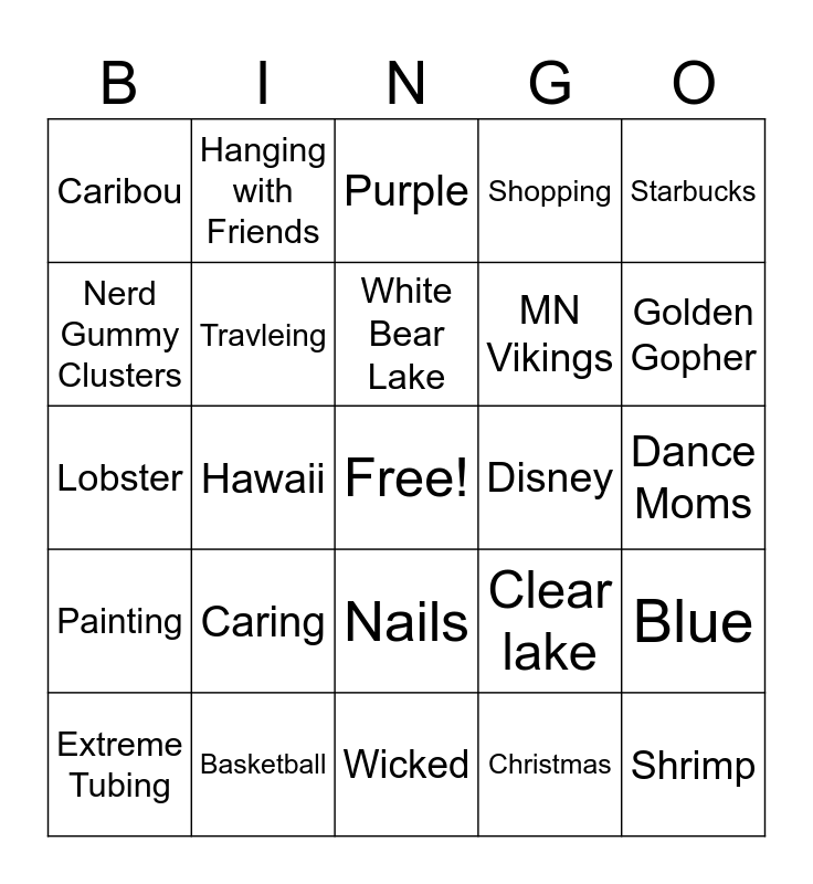 This bingo card has a free space and 34 words: Yellow, Moana 2, Sour Patch Kids, Ice Cream, Dance Moms, Nerd Gummy Clusters, Travleing, Wicked, MN Vikings, Shrimp, Lobster, Hanging with Friends, Christmas, Ocean, Painting, Hawaii, Nails, Disney, Blue, Extreme Tubing, Basketball, Pizza, Shopping, Golden Gopher, Braces, Caring, Purple, Florida, Starbucks, Caribou, My Birthday, White Bear Lake, Clear lake and Boating.