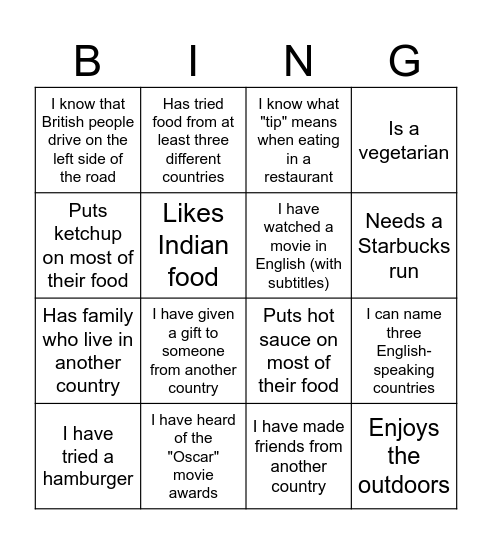 This bingo card has 30 words: I was born outside of China, I have watched a sports event like the Super Bowl or the World Cup, I can name three English-speaking countries, I’ve heard of a holiday called “Thanksgiving, I know that British people drive on the left side of the road, I know what "tip" means when eating in a restaurant, I have watched a movie in English (with subtitles), I have been to a foreign embassy or consulate, I have heard of the "Oscar" movie awards, I know what "tongue twisters" are in English, I have made friends from another country, I have tried a hamburger, I have tried a British full English breakfast (with eggs, bacon, beans, etc.), I know what a "double-decker bus" is, I have given a gift to someone from another country, I know the difference between "there," "their," and "they’re, Has had more than 2 jobs in their career, Enjoys the outdoors, Ate dinner with their family as a child each night, Puts ketchup on most of their food, Puts hot sauce on most of their food, Has had their name mispronounced (first or last), Has tried food from at least three different countries, Has family who live in another country, Likes Indian food, Is a vegetarian, Has worn traditional attire from another country, Can speak 3 or more languages, Needs a Starbucks run and Rode on the bus to get to school as a child.