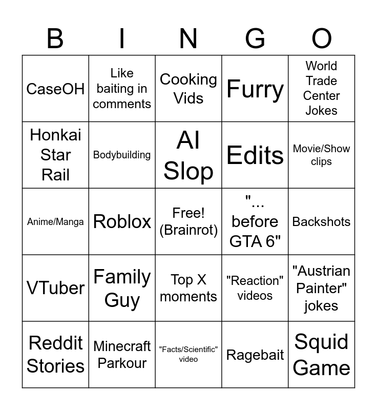 This bingo card has a free space and 24 words: Family Guy, Minecraft Parkour, AI Slop, Reddit Stories, World Trade Center Jokes, CaseOH, Honkai Star Rail, Like baiting in comments, "... before GTA 6", Top X moments, Edits, Anime/Manga, "Reaction" videos, "Austrian Painter" jokes, Bodybuilding, Ragebait, Backshots, Cooking Vids, Movie/Show clips, Roblox, Squid Game, VTuber, Furry and "Facts/Scientific" video.