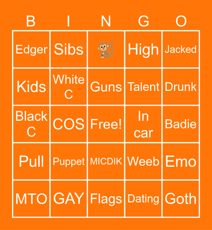 This bingo card has a free space and 24 words: Puppet, GAY, Guns, MTO, Jacked, Edger, Kids, Sibs, In car, MICDIK, Talent, Black C, Weeb, Emo, White C, Dating, Badie, 🐒, Drunk, COS, Goth, Pull, High and Flags.