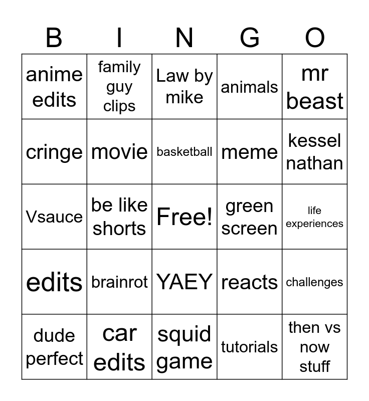 This bingo card has a free space and 24 words: brainrot, car edits, basketball, dude perfect, mr beast, anime edits, cringe, family guy clips, green screen, YAEY, meme, Vsauce, reacts, challenges, movie, tutorials, life experiences, Law by mike, kessel nathan, be like shorts, then vs now stuff, edits, animals and squid game.