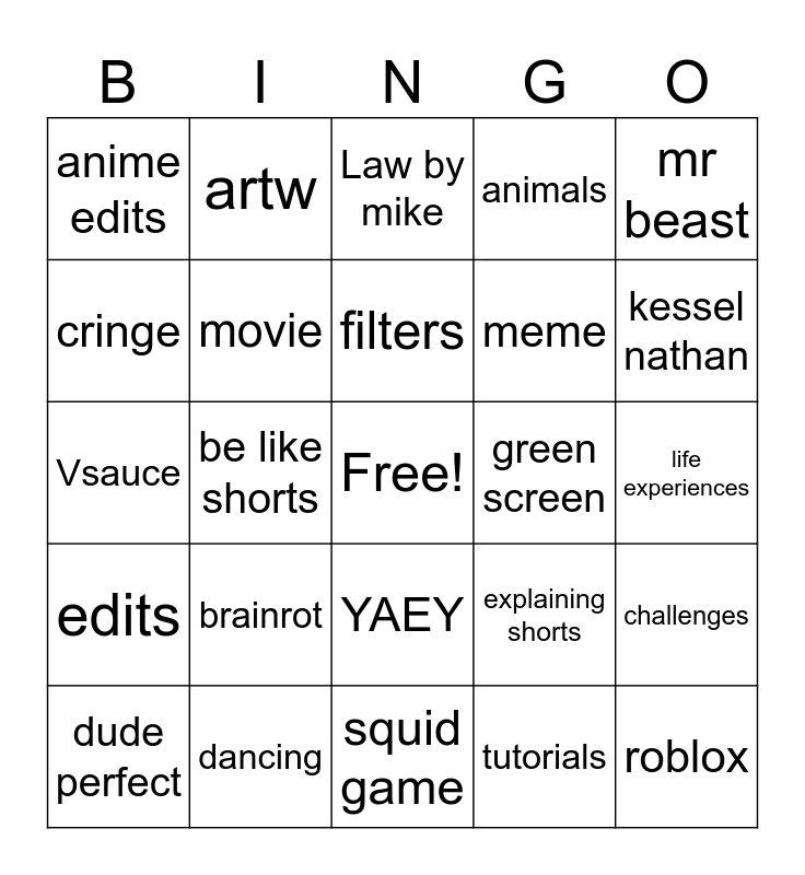 This bingo card has a free space and 24 words: brainrot, dancing, filters, dude perfect, mr beast, anime edits, cringe, artw, green screen, YAEY, meme, Vsauce, explaining shorts, challenges, movie, tutorials, life experiences, Law by mike, kessel nathan, be like shorts, roblox, edits, animals and squid game.