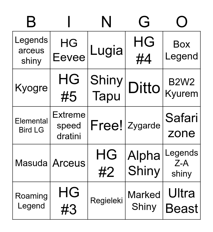 This bingo card has a free space and 24 words: Arceus, HG #3, Shiny Tapu, Roaming Legend, Box Legend, Legends arceus shiny, Kyogre, HG Eevee, Zygarde, HG #2, Ditto, Elemental Bird LG, Alpha Shiny, Legends Z-A shiny, HG #5, Marked Shiny, Safari zone, Lugia, B2W2 Kyurem, Extreme speed dratini, Ultra Beast, Masuda, HG #4 and Regieleki.