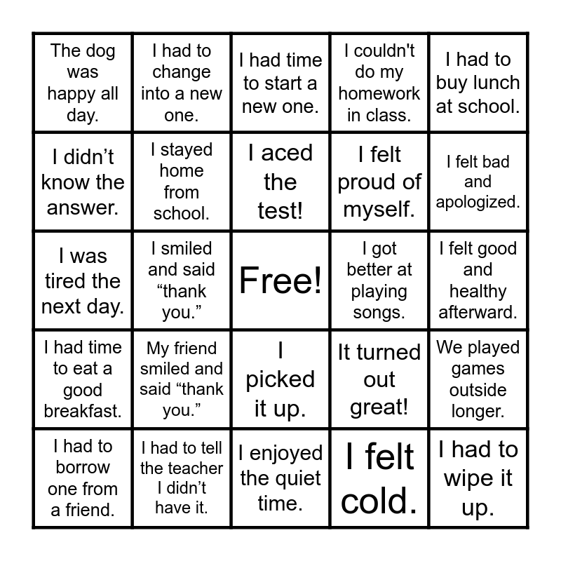 This bingo card has a free space and 35 words: I got a bad grade., I had a stomach ache., I wore my sunglasses., I stayed home from school., I picked it up., I couldn't do my homework in class., I didn’t know the answer., I felt sad., I aced the test!, I got wet in the rain., I was tired the next day., I had to buy lunch at school., We had to go inside., It melted on the ground., The dog was happy all day., I got better at playing songs., I felt cold., I smiled and said “thank you.”, I had time to eat a good breakfast., I had to wipe it up., It turned out great!, I had to borrow one from a friend., We played games outside longer., I had to tell the teacher I didn’t have it., I had time to start a new one., I felt bad and apologized., It was time to go to the next class., I made a mistake on my assignment., I felt proud of myself., I felt good and healthy afterward., I got a sunburn., I enjoyed the quiet time., My friend smiled and said “thank you.”, I had to change into a new one. and I couldn’t wait to start reading it..