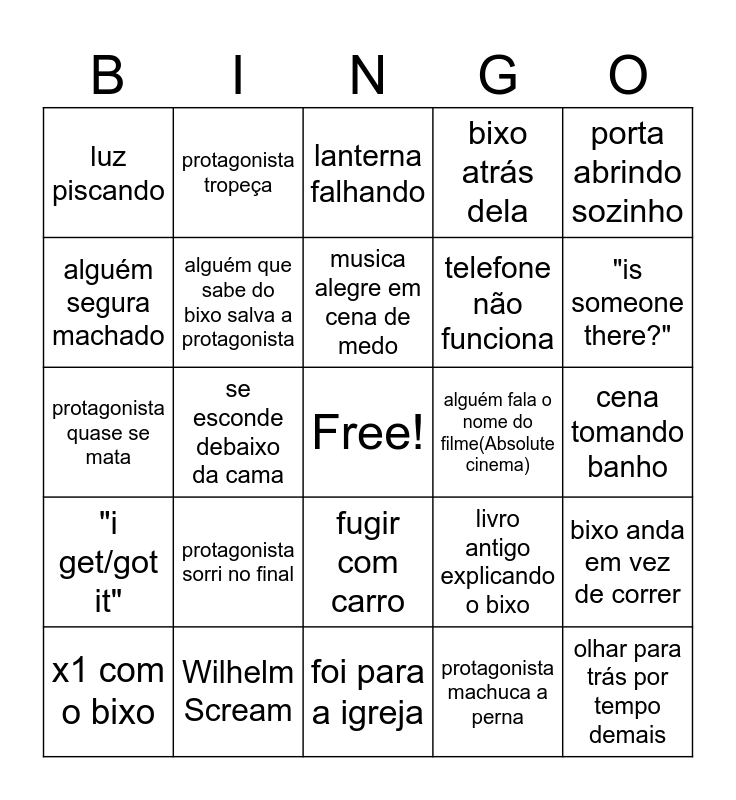This bingo card has a free space and 24 words: protagonista sorri no final, Wilhelm Scream, musica alegre em cena de medo, x1 com o bixo, porta abrindo sozinho, luz piscando, alguém segura machado, protagonista tropeça, alguém fala o nome do filme(Absolute cinema), fugir com carro, telefone não funciona, protagonista quase se mata, livro antigo explicando o bixo, bixo anda em vez de correr, alguém que sabe do bixo salva a protagonista, protagonista machuca a perna, cena tomando banho, lanterna falhando, "is someone there?", se esconde debaixo da cama, olhar para trás por tempo demais, "i get/got it", bixo atrás dela and foi para a igreja.
