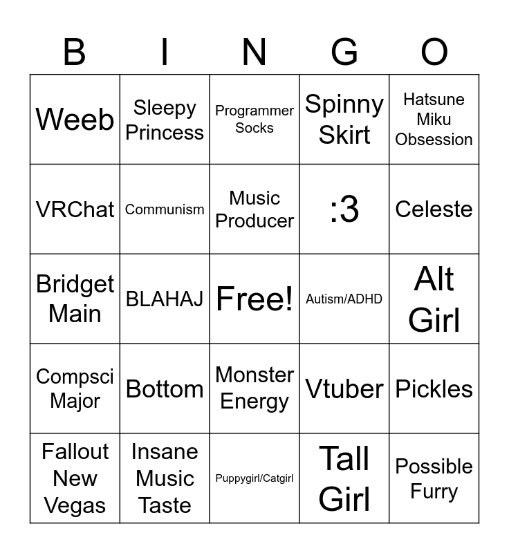 This bingo card has a free space and 24 words: Fallout New Vegas, Bottom, Music Producer, Tall Girl, Hatsune Miku Obsession, Weeb, Sleepy Princess, Programmer Socks, Autism/ADHD, Alt Girl, Bridget Main, Communism, Vtuber, Pickles, VRChat, Insane Music Taste, Puppygirl/Catgirl, Spinny Skirt, Celeste, Compsci Major, BLAHAJ, Monster Energy, :3 and Possible Furry.