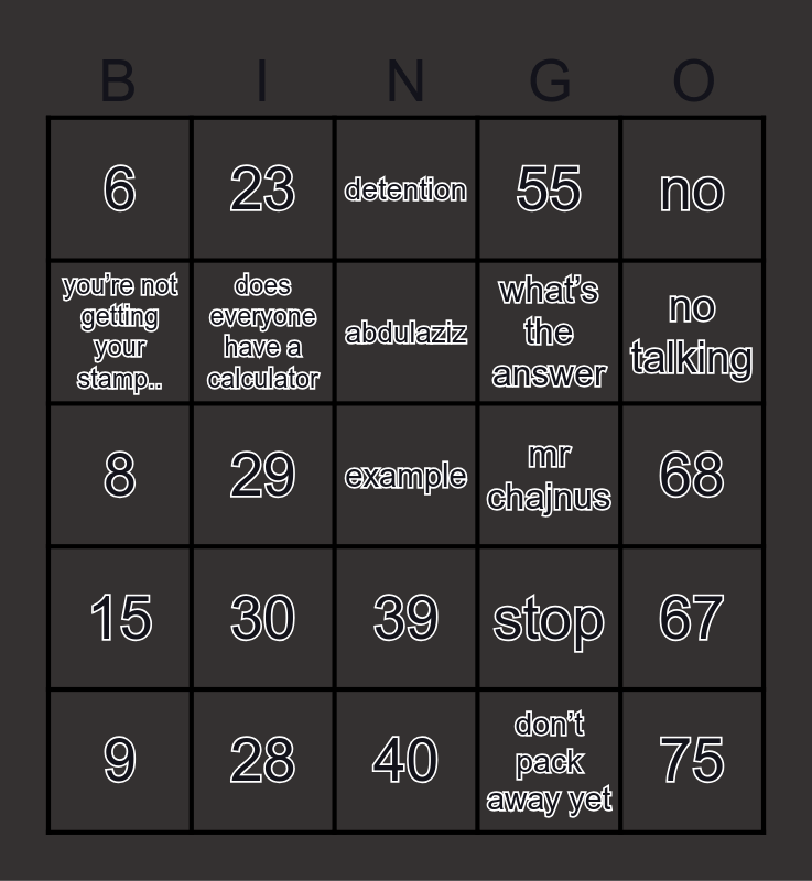 This bingo card has a free space and 75 words: head up, take your planners out, detention, does anyone have any questions, reminder, warning, we still have time, take coats off, don’t pack away yet, glue in the sheet, green pen, no equipment, mr chajnus, no talking, not quite, does everyone have a calculator, i have to email mr amigowar, stop, blazers on, you’re not getting your stamp.., what you do is, abdulaziz, what’s the answer, no, 6, 21, 35, 51, 66, 7, 22, 36, 52, 67, 8, 23, 37, 53, 68, 9, 24, 38, 54, 69, 10, 25, 39, 55, 70, 11, 26, 40, 56, 71, 12, 27, 41, 57, 72, 13, 28, 42, 58, 73, 14, 29, 43, 59, 74, 15, 30, 44, 60, 75 and 45.