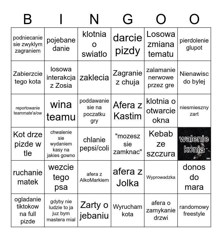 This bingo card has 1 images and 36 words: afera z Jolka, afera z AlkoMarkiem, Wyrucham kota, Zabierzcie tego kota, Kot drze pizde w tle, Afera z Kastim, losowa interakcja z Zosia, Zarty o jebaniu, Losowa zmiana tematu, Wyprowadzka, Nienawisc do bylej, darcie pizdy, donos do mara, wina teamu, Zagranie z chuja, podniecanie sie zwyklym zagraniem, ruchanie matek, klotnia o otwarcie okna, reportowanie teammate'a/ow, klotnia o swiatlo, poddawanie sie na poczatku gry, chwalenie sie wydaniem kasy na jakies gowno, "mozesz sie zamknac", chlanie pepsi/coli, Kebab ze szczura, pojebane danie, zalamanie nerwowe przez gre, gdyby nie ludzie to ja juz bym mastera mial, zaklecia, pierdolenie glupot, randomowy freestyle, ogladanie tiktokow na full pizde, walenie konia, niesmieszny zart, wezcie tego psa and afera o zamykanie drzwi.
