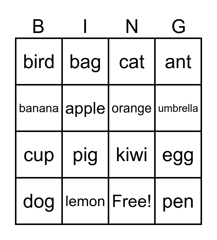 This bingo card has 17 words: Free!, dog, cat, bird, pig, ant, egg, orange, umbrella, apple, lemon, kiwi, banana, bag, cup, book and pen.