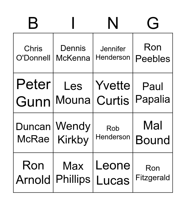 This bingo card has 30 words: Sabrina Pilkington, John Adams, Mal Bound, Alan Bremner, Chris O'Donnell, Jennifer Henderson, Yvette Curtis, Neville Crilly, Max Phillips, Owen Daley, Leone Lucas, Ron Arnold, James Darcy, Suzanne Aitken, Wendy Kirkby, Noelene O'Donnell, Jason Agha, Ron Fitzgerald, Robin Fitgerald, Peter Gunn, Rob Henderson, Trevor Margetson, Dennis McKenna, Duncan McRae, Les Mouna, Ron Peebles, Vance Vlahov, Robin Wingrove, Paul Papalia and Neita Stewart.