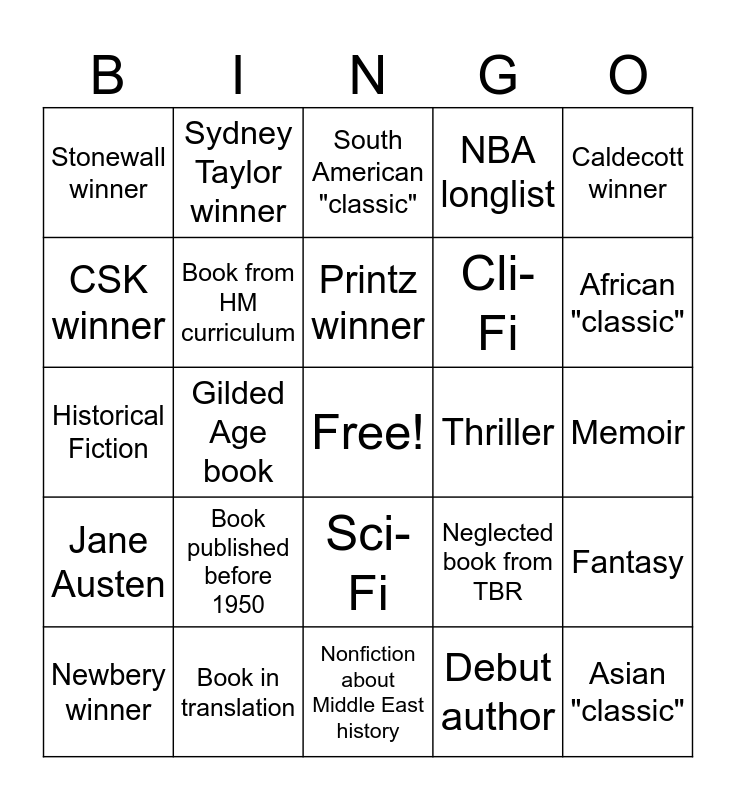 This bingo card has a free space and 24 words: Book published before 1950, Book in translation, Printz winner, Newbery winner, Caldecott winner, Stonewall winner, CSK winner, Sydney Taylor winner, Thriller, Sci-Fi, Cli-Fi, Historical Fiction, Neglected book from TBR, Fantasy, Book from HM curriculum, Debut author, Memoir, South American "classic", African "classic", Gilded Age book, Asian "classic", Jane Austen, NBA longlist and Nonfiction about Middle East history.