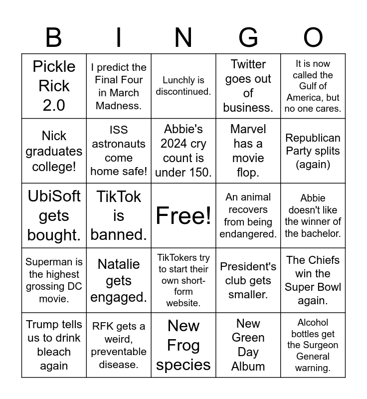 This bingo card has a free space and 70 words: I get a bird flu vaccine, Abbie doesn't like the winner of the bachelor., Mario Kart 9 does NOT come out., The cure for HIV makes it to clinical trials., RFK gets a weird, preventable disease., Scotland splits from the UK., Twitter goes out of business., US annexes Mars, It is now called the Gulf of America, but no one cares., Trans people win the SCOTUS case., The Chiefs win the Super Bowl again., The U.S. stops minting pennies., Pickle Rick 2.0, Lunchly is discontinued., Ex-TikTok stars make a movie., TikTok is banned., TikTokers try to start their own short-form website., Marvel has a movie flop., Jack and Harry Taggart celebrate birthday 17!, Superman is the highest grossing DC movie., An animal recovers from being endangered., President's club gets smaller., Republican Party splits (again), Another War, New Pope, Train Workers Strike, Insurance Reform, Major band reunion tour, New Green Day Album, Kendrick disses Drake at Super Bowl., I predict the Final Four in March Madness., Taylor Swift gets to play the next Super Bowl., DnD Campaign actually finishes., Katie starts her Starfinder campaign., Obama gets a late night talk show., Bradley play tests his game system., Abbie adopts a cat., Abbie passes the FE., Katie graduates college!, Nick graduates college!, JD Vance gets divorced., Natalie gets engaged., Alcohol bottles get the Surgeon General warning., Katie moves to DC., Bradley's wife gets her Green Card., ISS astronauts come home safe!, Trump tells us to drink bleach again, Elton John Goodbye Tour 2.0, AI gets regulated., Another congress person turns out to be a total liar. (a la George Santos), Cybertrucks are recalled., Cybertrucks are banned., Another world leader resigns., Prisoners from Gaza get released., New Frog species, Imane Khelif wins her defamation case!, Abbie's 2024 cry count is under 150., Natalie learns how to use her sewing machine., Katie learns a new craft., Zoey gets a promotion!, UbiSoft gets bought., Texas has a power outage due to weather., La Niña is a major weather event this year., Major volcanic eruption, Major city has extended power outage., Diddy gets 10+ life sentences., Joe Joe gets to 14 lbs., Pepper gets up to 4 lbs., New prime number (larger than 2^136,279,841 − 1) and 10 Mil+ sub YouTuber retires.