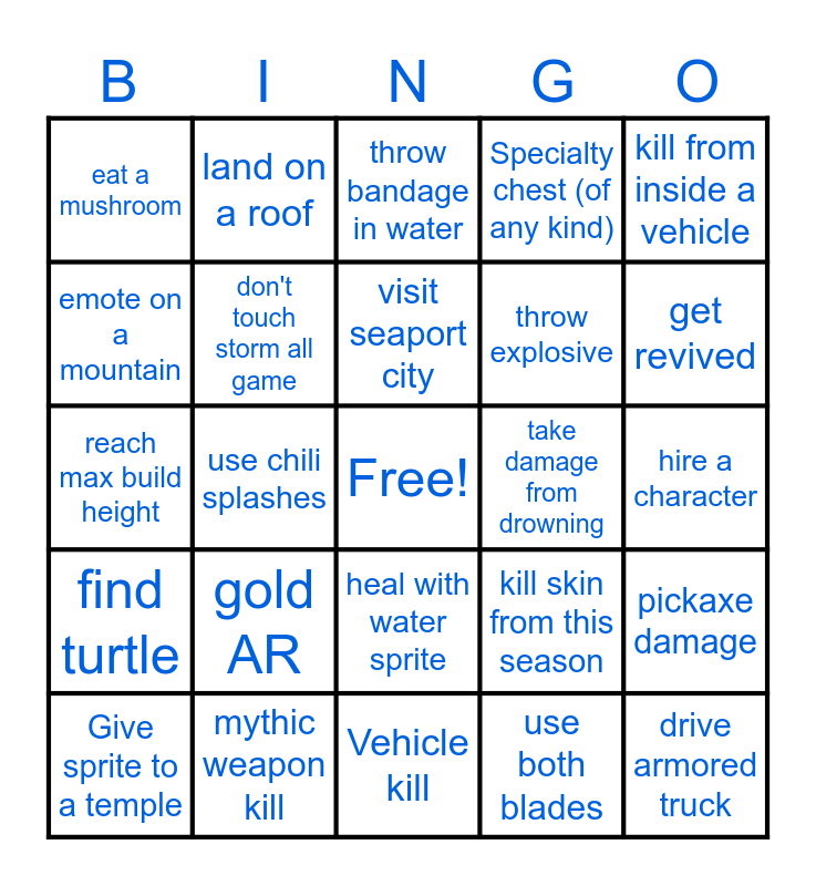 This bingo card has a free space and 24 words: Give sprite to a temple, gold AR, visit seaport city, use both blades, kill from inside a vehicle, eat a mushroom, land on a roof, throw bandage in water, take damage from drowning, hire a character, reach max build height, don't touch storm all game, kill skin from this season, pickaxe damage, emote on a mountain, mythic weapon kill, Vehicle kill, Specialty chest (of any kind), get revived, find turtle, use chili splashes, heal with water sprite, throw explosive and drive armored truck.