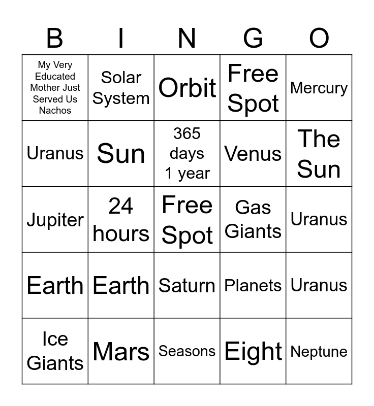 This bingo card has a free space and 24 words: Earth, Mars, 365 days 1 year, Ice Giants, Mercury, My Very Educated Mother Just Served Us Nachos, Uranus, Solar System, Gas Giants, Saturn, Venus, Jupiter, Planets, Uranus, Sun, Eight, Uranus, Orbit, The Sun, 24 hours, Neptune, Earth, Free Spot and Seasons.