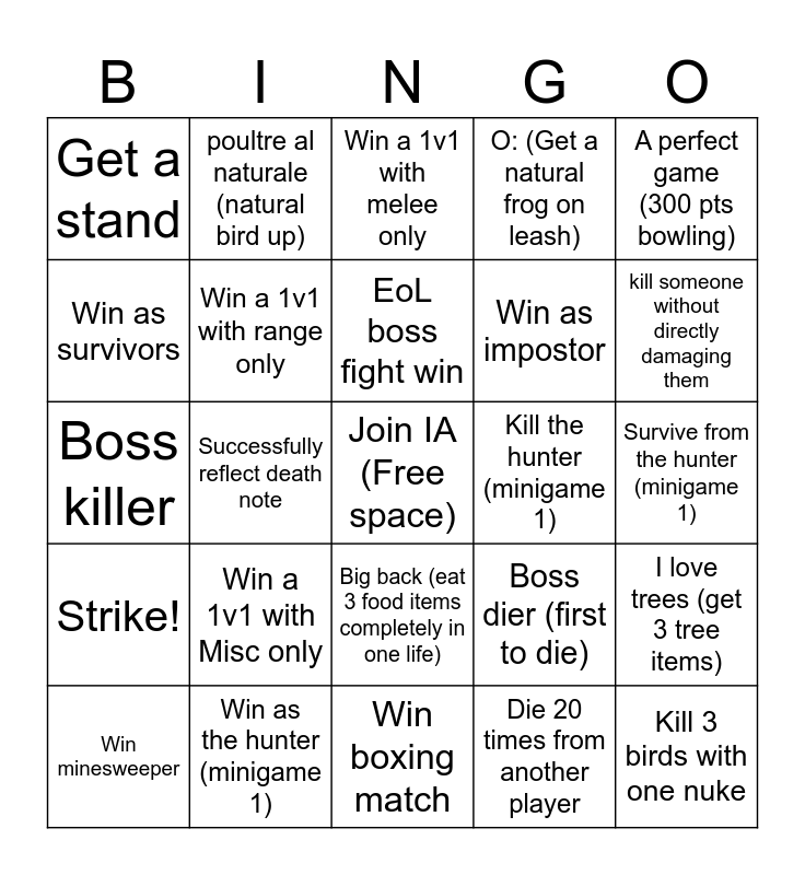 This bingo card has a free space and 29 words: Win minesweeper, Bird up!, Successfully reflect death note, Parry a roadroller/apc, Get a stand, Win a 1v1 with melee only, Win a 1v1 with range only, Win a 1v1 with Misc only, Kill the hunter (minigame 1), Win as the hunter (minigame 1), Survive from the hunter (minigame 1), Kill 3 birds with one nuke, Win boxing match, Die 20 times from another player, kill someone without directly damaging them, BEAN*FLING*, Big back (eat 3 food items completely in one life), Strike!, A perfect game (300 pts bowling), Boss killer, Boss dier (first to die), Be Gone! (klev dies), Win as impostor, Win as survivors, O: (Get a natural frog on leash), poultre al naturale (natural bird up), I love trees (get 3 tree items), EoL boss fight win and EoL boss win.