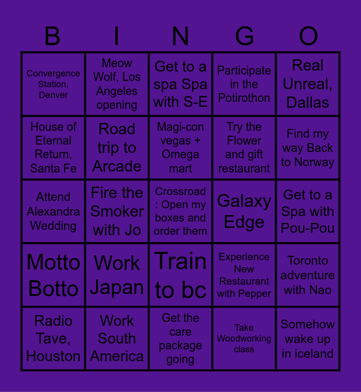 This bingo card has a free space and 24 words: Work Japan, Work South America, Magi-con vegas + Omega mart, Radio Tave, Houston, Real Unreal, Dallas, Convergence Station, Denver, House of Eternal Return, Santa Fe, Meow Wolf, Los Angeles opening, Galaxy Edge, Train to bc, Try the Flower and gift restaurant, Attend Alexandra Wedding, Experience New Restaurant with Pepper, Toronto adventure with Nao, Road trip to Arcade, Take Woodworking class, Get to a Spa with Pou-Pou, Get to a spa Spa with S-E, Find my way Back to Norway, Fire the Smoker with Jo, Somehow wake up in iceland, Motto Botto, Participate in the Potirothon and Get the care package going.