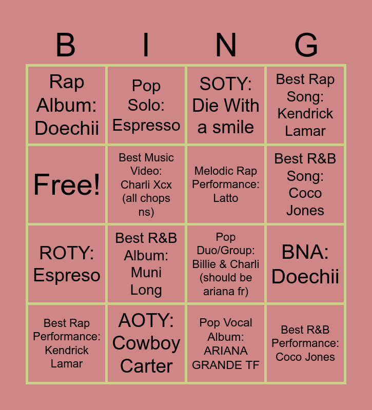 This bingo card has 16 words: AOTY: Cowboy Carter, BNA: Doechii, SOTY: Die With a smile, Rap Album: Doechii, ROTY: Espreso, Pop Solo: Espresso, Pop Duo/Group: Billie & Charli (should be ariana fr), Pop Vocal Album: ARIANA GRANDE TF, Free!, Best Music Video: Charli Xcx (all chops ns), Best Rap Performance: Kendrick Lamar, Best Rap Song: Kendrick Lamar, Best R&B Album: Muni Long, Best R&B Song: Coco Jones, Melodic Rap Performance: Latto and Best R&B Performance: Coco Jones.