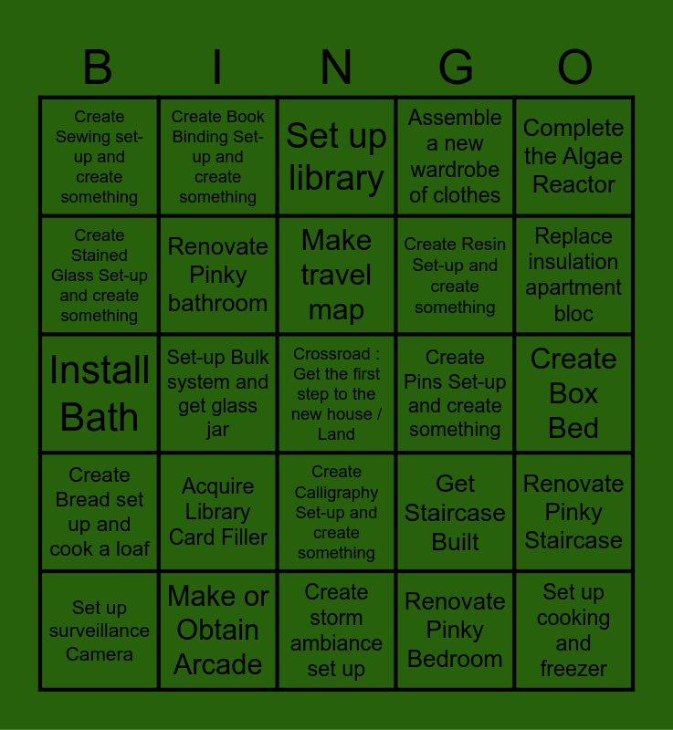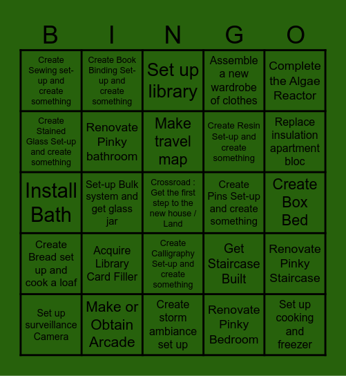 This bingo card has a free space and 24 words: Acquire Library Card Filler, Make or Obtain Arcade, Make travel map, Set up surveillance Camera, Complete the Algae Reactor, Create Sewing set-up and create something, Create Stained Glass Set-up and create something, Create Book Binding Set-up and create something, Create Pins Set-up and create something, Create Calligraphy Set-up and create something, Create Resin Set-up and create something, Install Bath, Get Staircase Built, Renovate Pinky Staircase, Renovate Pinky bathroom, Renovate Pinky Bedroom, Create Box Bed, Set up library, Replace insulation apartment bloc, Set-up Bulk system and get glass jar, Set up cooking and freezer, Create Bread set up and cook a loaf, Assemble a new wardrobe of clothes and Create storm ambiance set up.