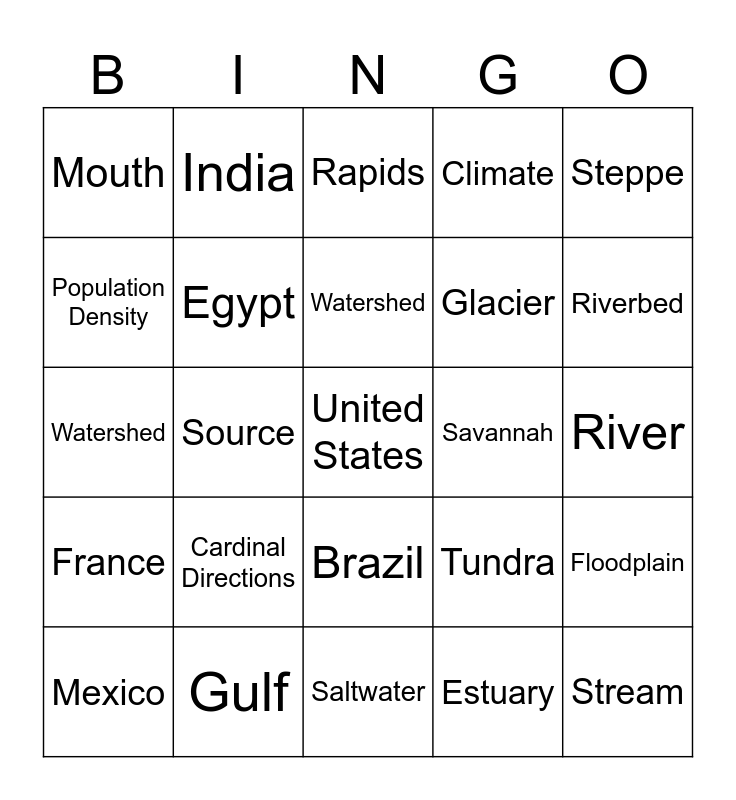 This bingo card has 100 words: Mountain, Valley, River, Ocean, Desert, Plateau, Hill, Canyon, Coastline, Peninsula, Archipelago, Island, Bay, Gulf, Cliff, Plain, Glacier, Volcano, Crater, Hillock, Cave, Fjord, Dune, Marsh, Wetland, Savannah, Steppe, Tundra, Ridge, Basin, Source, Mouth, Tributary, Delta, Estuary, Watershed, Floodplain, Meander, Riverbank, Stream, Tributary, Confluence, Watershed, Canal, Riverbed, Rapids, Waterfall, Spring, Freshwater, Saltwater, Latitude, Longitude, Equator, Prime Meridian, Hemisphere, Continent, Country, Border, Region, Climate, Weather, Urban, Rural, Population, Settlement, Migration, Cartography, Globe, Map, Scale, Compass, Cardinal Directions, Topography, Relief, Map Key/Legend, GPS, Time Zone, Population Density, Natural Resources, Ecosystem, Australia, United States, Canada, Brazil, China, India, Russia, United Kingdom, Germany, France, South Africa, Japan, Argentina, Mexico, Egypt, Antarctica, Italy, Spain, New Zealand and Saudi Arabia.