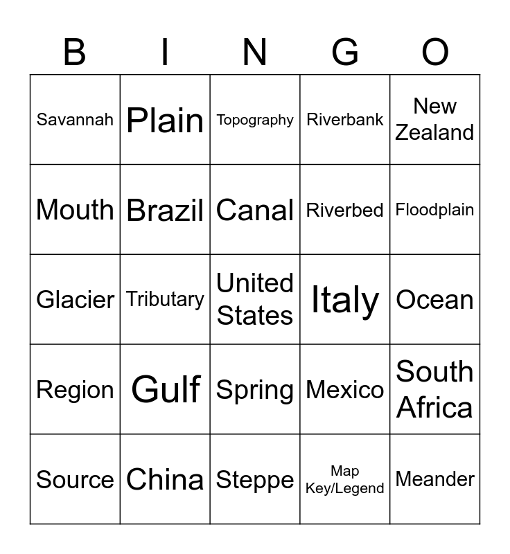 This bingo card has 98 words: Mountain, Valley, River, Ocean, Desert, Plateau, Hill, Canyon, Coastline, Peninsula, Archipelago, Island, Bay, Gulf, Cliff, Plain, Glacier, Volcano, Crater, Hillock, Cave, Fjord, Dune, Marsh, Wetland, Savannah, Steppe, Tundra, Ridge, Basin, Source, Mouth, Delta, Estuary, Floodplain, Meander, Riverbank, Stream, Tributary, Confluence, Watershed, Canal, Riverbed, Rapids, Waterfall, Spring, Freshwater, Saltwater, Latitude, Longitude, Equator, Prime Meridian, Hemisphere, Continent, Country, Border, Region, Climate, Weather, Urban, Rural, Population, Settlement, Migration, Cartography, Globe, Map, Scale, Compass, Cardinal Directions, Topography, Relief, Map Key/Legend, GPS, Time Zone, Population Density, Natural Resources, Ecosystem, Australia, United States, Canada, Brazil, China, India, Russia, United Kingdom, Germany, France, South Africa, Japan, Argentina, Mexico, Egypt, Antarctica, Italy, Spain, New Zealand and Saudi Arabia.