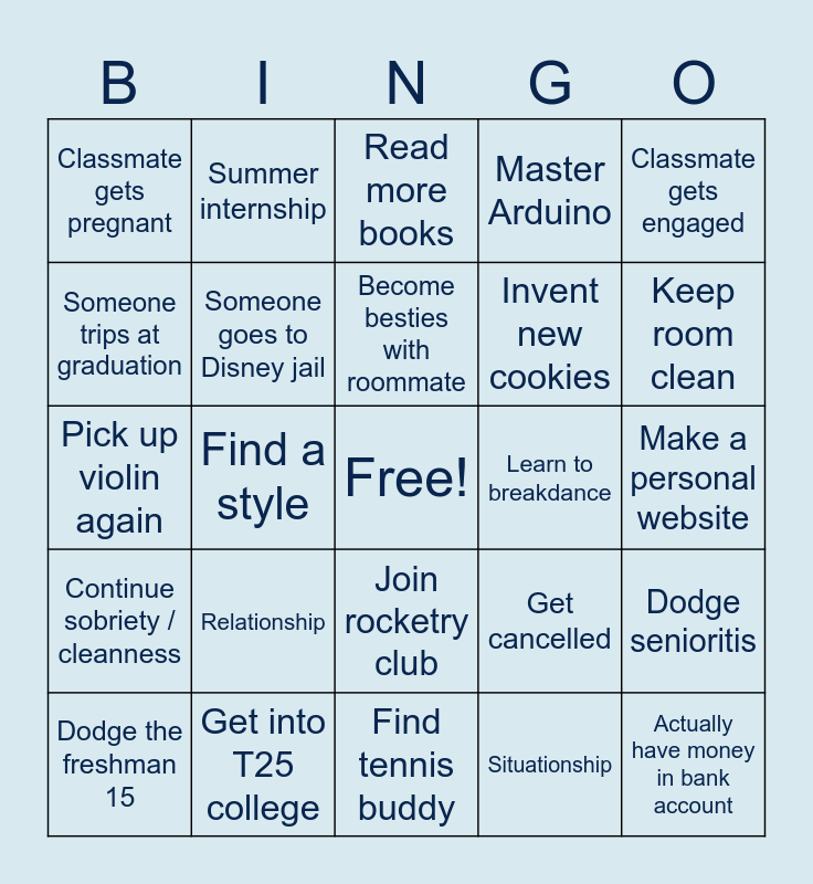This bingo card has a free space and 24 words: Relationship, Get into T25 college, Become besties with roommate, Dodge the freshman 15, Classmate gets engaged, Classmate gets pregnant, Someone trips at graduation, Summer internship, Learn to breakdance, Join rocketry club, Invent new cookies, Pick up violin again, Get cancelled, Dodge senioritis, Someone goes to Disney jail, Situationship, Make a personal website, Read more books, Keep room clean, Find a style, Actually have money in bank account, Continue sobriety / cleanness, Master Arduino and Find tennis buddy.