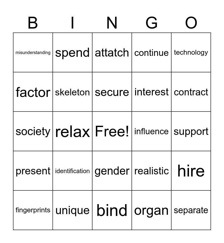 This bingo card has a free space and 24 words: identification, unique, secure, fingerprints, technology, misunderstanding, factor, spend, influence, gender, interest, society, realistic, hire, skeleton, organ, support, attatch, contract, relax, separate, present, continue and bind.