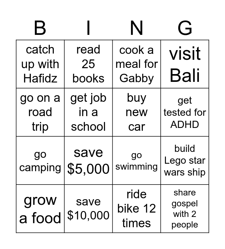 This bingo card has 16 words: save $10,000, build Lego star wars ship, cook a meal for Gabby, catch up with Hafidz, go camping, read 25 books, go swimming, ride bike 12 times, go on a road trip, get job in a school, grow a food, visit Bali, save $5,000, get tested for ADHD, buy new car and share gospel with 2 people.