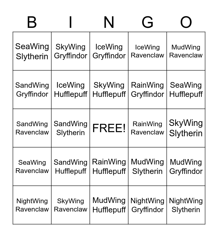 This bingo card has a free space and 28 words: MudWing Gryffindor, SeaWing Gryffindor, RainWing Gryffindor, NightWing Gryffindor, SandWing Gryffindor, IceWing Gryffindor, SkyWing Gryffindor, SeaWing Ravenclaw, RainWing Ravenclaw, NightWing Ravenclaw, SandWing Ravenclaw, IceWing Ravenclaw, SkyWing Ravenclaw, MudWing Hufflepuff, SeaWing Hufflepuff, NightWing Hufflepuff, SandWing Hufflepuff, IceWing Hufflepuff, SkyWing Hufflepuff, RainWing Hufflepuff, SeaWing Slytherin, RainWing Slytherin, NightWing Slytherin, SandWing Slytherin, SkyWing Slytherin, MudWing Slytherin, MudWing Ravenclaw and IceWing Slytherin.