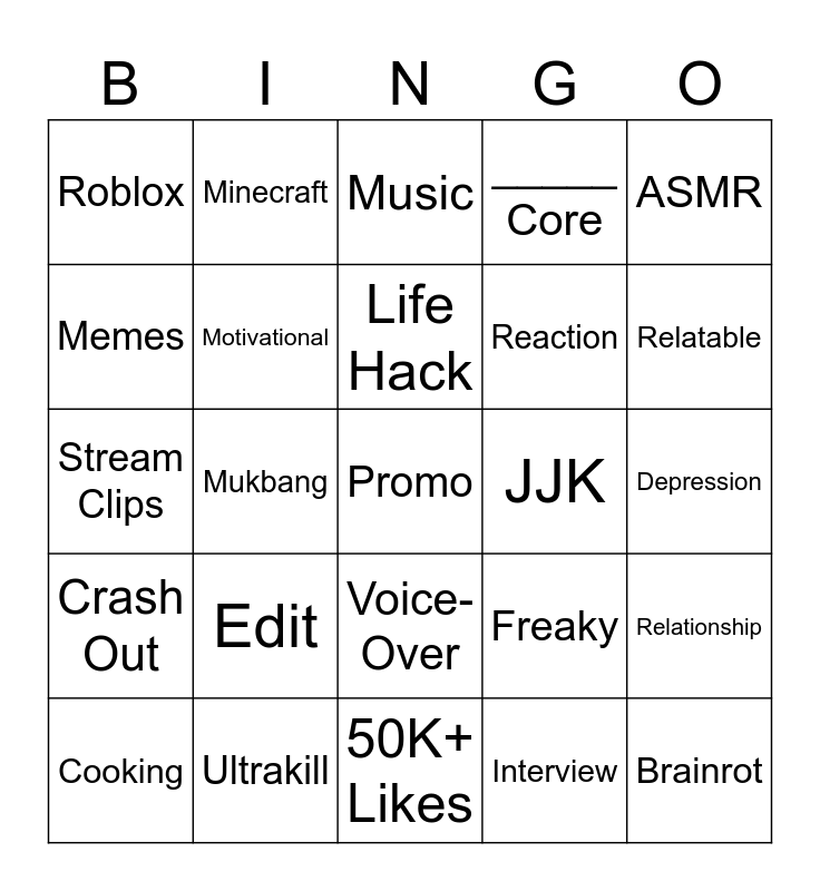 This bingo card has a free space and 24 words: Edit, Ultrakill, Life Hack, Cooking, ASMR, Roblox, Memes, Minecraft, JJK, Voice-Over, Reaction, Stream Clips, Freaky, Relationship, Motivational, Interview, Depression, Music, Relatable, Mukbang, Brainrot, Crash Out, _____ Core and 50K+ Likes.