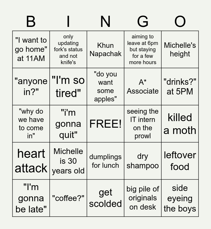 This bingo card has a free space and 24 words: Michelle is 30 years old, "coffee?", "do you want some apples", "I'm gonna be late", Michelle's height, "I want to go home" at 11AM, "anyone in?", only updating fork's status and not knife's, seeing the IT intern on the prowl, dumplings for lunch, A* Associate, "why do we have to come in", dry shampoo, leftover food, "I'm so tired", big pile of originals on desk, killed a moth, Khun Napachak, "drinks?" at 5PM, "i'm gonna quit", side eyeing the boys, heart attack, aiming to leave at 6pm but staying for a few more hours and get scolded.