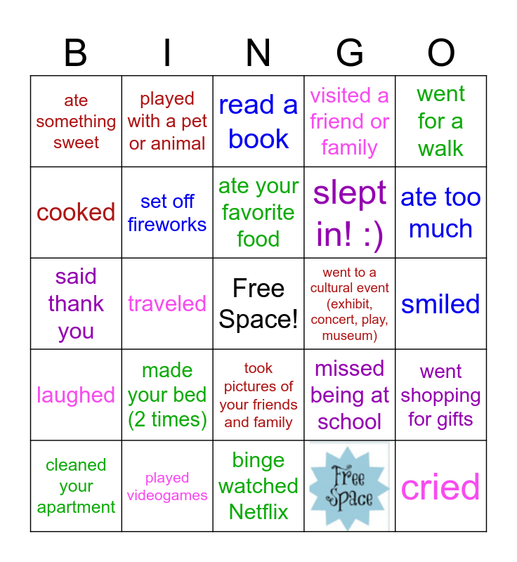 This bingo card has 1 images, a free space and 24 words: made your bed (2 times), binge watched Netflix, ate your favorite food, cleaned your apartment, went for a walk, ate something sweet, cooked, played with a pet or animal, went to a cultural event (exhibit, concert, play, museum), took pictures of your friends and family, slept in! :), said thank you, missed being at school, went shopping for gifts, set off fireworks, was kind to someone, smiled, read a book, ate too much, traveled, cried, played videogames, laughed and visited a friend or family.