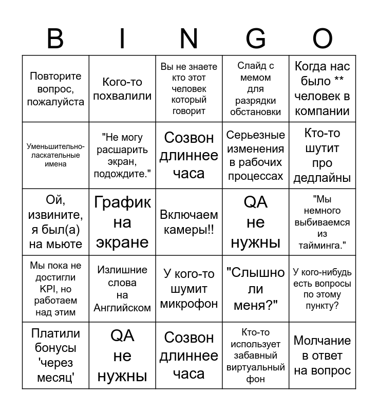 This bingo card has a free space and 24 words: Излишние слова на Английском, QA не нужны, Созвон длиннее часа, Платили бонусы 'через месяц', Когда нас было ** человек в компании, Повторите вопрос, пожалуйста, Уменьшительно- ласкательные имена, Кого-то похвалили, QA не нужны, У кого-то шумит микрофон, Серьезные изменения в рабочих процессах, Ой, извините, я был(а) на мьюте, "Слышно ли меня?", У кого-нибудь есть вопросы по этому пункту?, "Не могу расшарить экран, подождите.", Кто-то использует забавный виртуальный фон, "Мы немного выбиваемся из тайминга.", Вы не знаете кто этот человек который говорит, Кто-то шутит про дедлайны, График на экране, Молчание в ответ на вопрос, Мы пока не достигли KPI, но работаем над этим, Слайд с мемом для разрядки обстановки and Созвон длиннее часа.