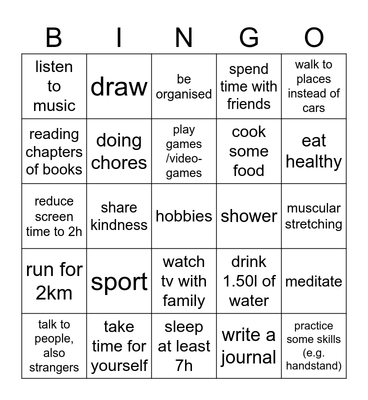 This bingo card has 25 words: sport, sleep at least 7h, play games /video-games, talk to people, also strangers, walk to places instead of cars, listen to music, reading chapters of books, draw, shower, watch tv with family, cook some food, reduce screen time to 2h, drink 1.50l of water, meditate, doing chores, practice some skills (e.g. handstand), muscular stretching, be organised, eat healthy, share kindness, hobbies, take time for yourself, run for 2km, spend time with friends and write a journal.