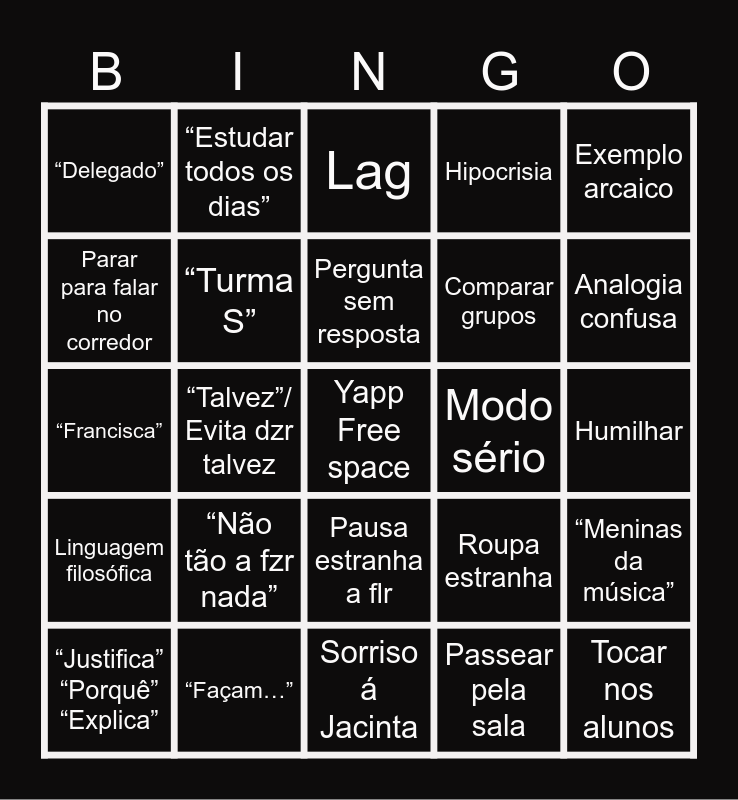 This bingo card has a free space and 29 words: “Justifica” “Porquê” “Explica”, “Vocês são de ciências”, “Talvez”/ Evita dzr talvez, Exemplo estupido, “Delegado”, Lag, “Turma S”, “Não tão a fzr nada”, Modo sério, “Façam…”, Humilhar, Tocar nos alunos, Sorriso á Jacinta, Passear pela sala, Analogia confusa, ????, Pausa estranha a flr, Linguagem filosófica, Exemplo arcaico, “Francisca”, Roupa estranha, Ralhar sobre TE, Comparar grupos, Parar para falar no corredor, Hipocrisia, “Estudar todos os dias”, “Meninas da música”, Pergunta sem resposta and Reclamar com o Cunha.
