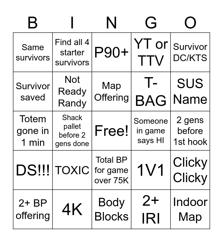 This bingo card has a free space and 24 words: TOXIC, 4K, Map Offering, 2+ BP offering, Survivor DC/KTS, Same survivors, Survivor saved, Find all 4 starter survivors, Someone in game says HI, Total BP for game over 75K, T-BAG, Totem gone in 1 min, 1V1, Clicky Clicky, Not Ready Randy, 2+ IRI, 2 gens before 1st hook, P90+, SUS Name, Shack pallet before 2 gens done, Indoor Map, DS!!!, YT or TTV and Body Blocks.