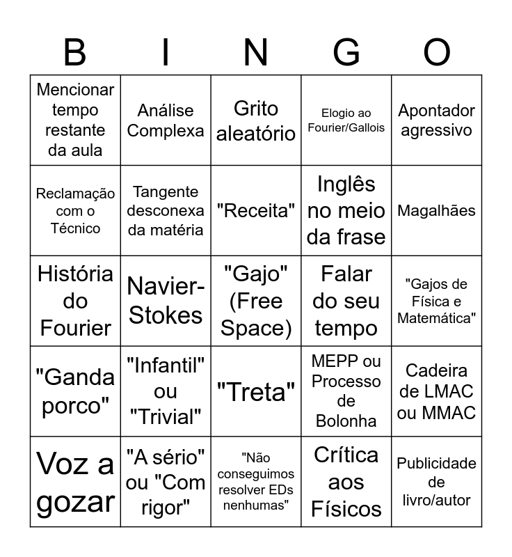 This bingo card has a free space and 24 words: "Infantil" ou "Trivial", "A sério" ou "Com rigor", "Receita", Voz a gozar, Apontador agressivo, Mencionar tempo restante da aula, Reclamação com o Técnico, Análise Complexa, Falar do seu tempo, "Treta", Inglês no meio da frase, História do Fourier, MEPP ou Processo de Bolonha, Cadeira de LMAC ou MMAC, Tangente desconexa da matéria, Crítica aos Físicos, "Gajos de Física e Matemática", Grito aleatório, Magalhães, Navier-Stokes, Publicidade de livro/autor, "Ganda porco", Elogio ao Fourier/Gallois and "Não conseguimos resolver EDs nenhumas".